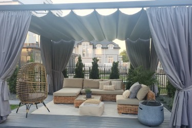 Prezentujemy Państwu projekt ogrodu wraz z wyposażeniem w Pergolę typu PALMERA Skalmar.