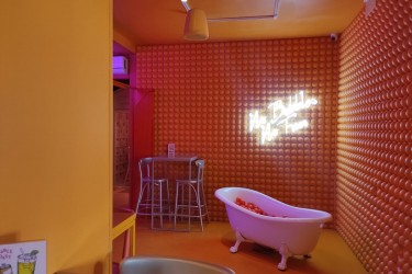 Kraty nożycowe w kolorze pomarańczowym w knajpie BUBBLE TOAST – Przy placu Szczepańskim 5 w Krakowie